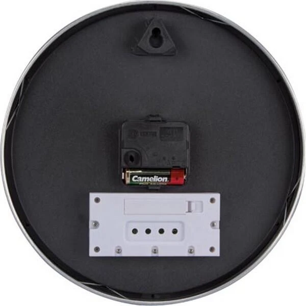 Wandklok met aluminium behuizing. Deze klok is voorzien van een LCD-display die de temperatuur en de luchtvochtigheid weergeeft.